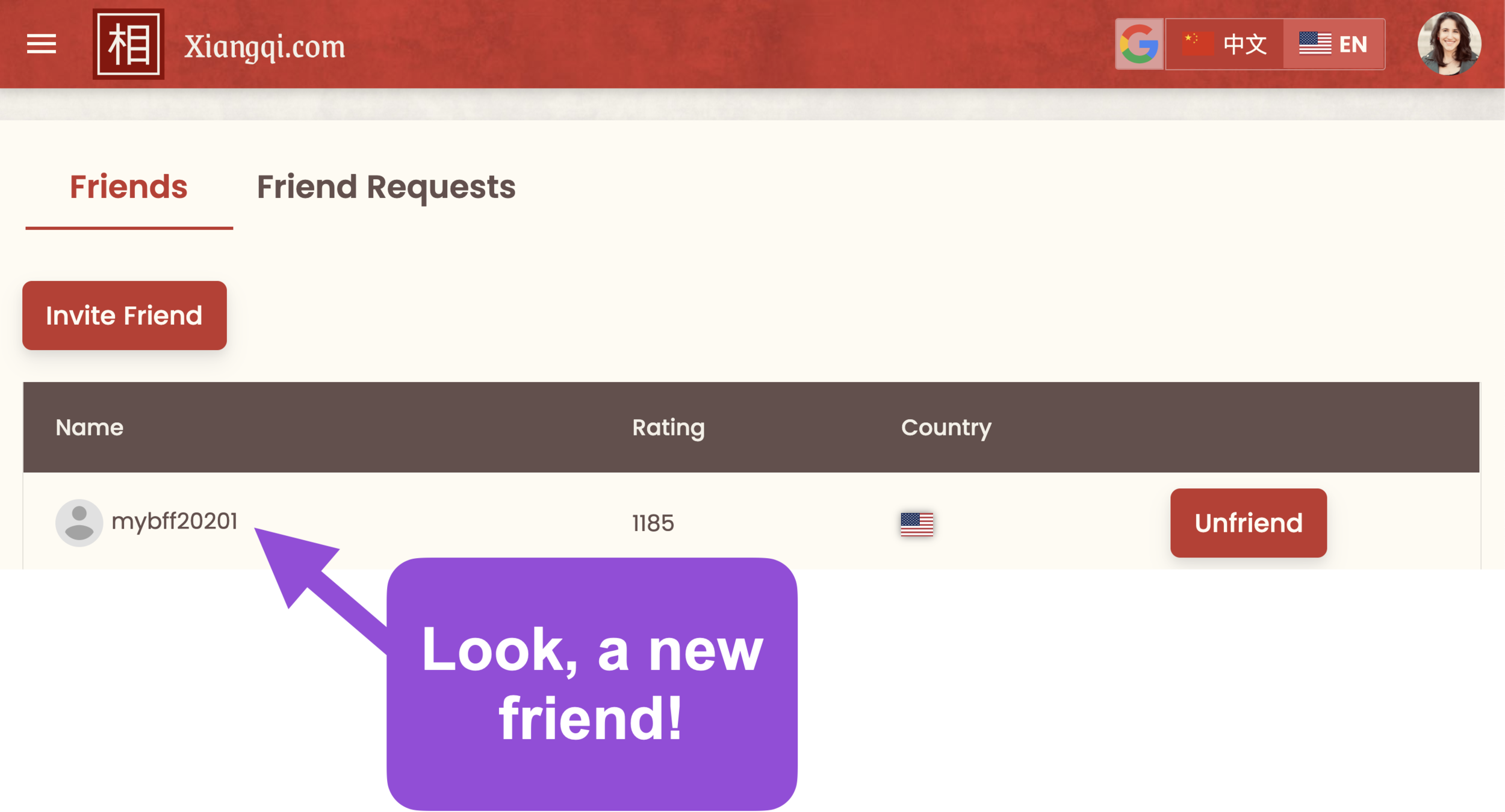 When they sign up for an account, you’ll see their username under your Friends List so you can challenge them to a game of xiangqi! 🎉